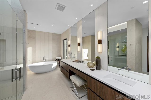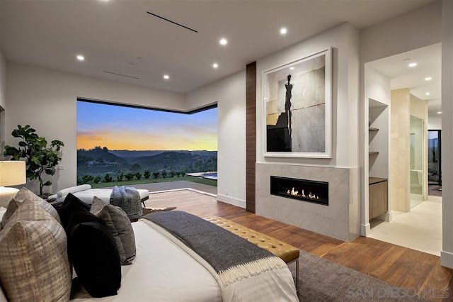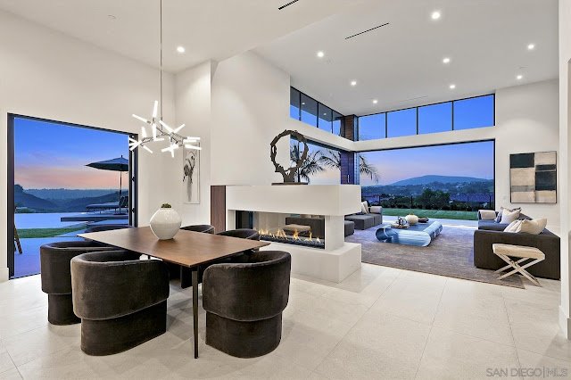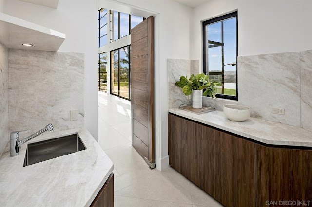 Located in guard-gated Rancho Del Lago and sited on 5.46 acres of land with unobstructed vista views, the like-new contemporary mansion at 18490 Lago Vista was designed by architect Richard Salpietra and showcases a host of simple lines and bold shapes. With an exterior clad in stone, stucco, and stained wood, the striking residence boasts an interior rich in volume with an emphasis on seamless indoor/outdoor living.