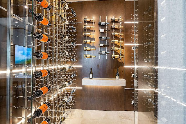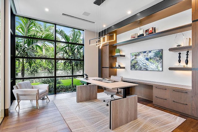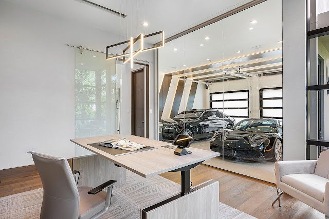 The waterfront abode features approximately 11,471 square feet of living space with six bedrooms, eight full and two half bathrooms, two-story foyer with open-tread floating staircase, an elevator, great room with fireplace, formal dining room and butler’s pantry, an eat-in gourmet kitchen with double islands, breakfast room, an expansive club room with wet bar and wine vault, home office with floor-to-ceiling glass wall looking into a two-car garage, exercise/massage room, second floor gallery and living room, first and second floor laundry rooms, garage parking for five cars, and much more.