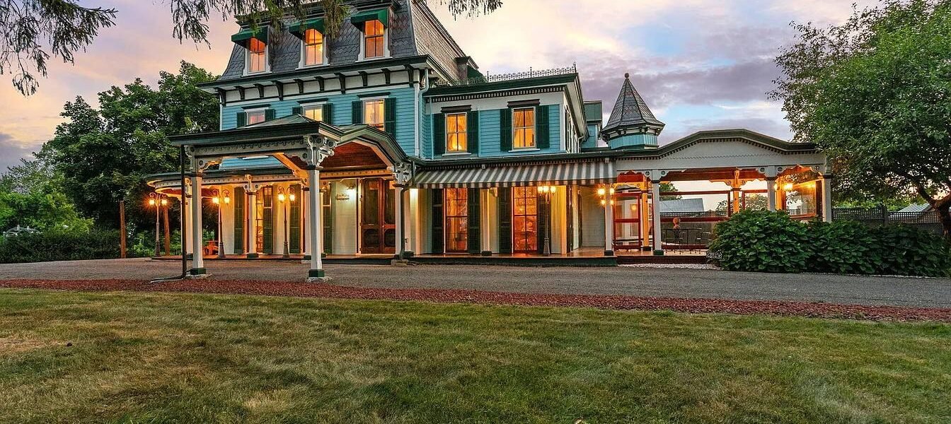 Welcome to this Exquisite Second Empire Victorian Estate on Expansive Grounds beautifully preserved and thoughtfully renovated, nestled on a sprawling manicured property. This grand estate exudes timeless charm and architectural elegance with its ornate detailing, stately columns, and vibrant exterior that captures the spirit of classic 19th-century design.