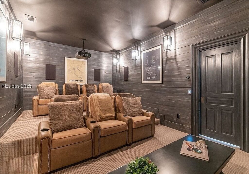 The waterfront abode features approximately 8,025 square feet of living space with five bedrooms, six full and one half bathrooms, a foyer with staircase, an elevator, a two-story living room with stone fireplace flanked by custom built-ins, family room with brick fireplace, an eat-in gourmet kitchen, a separate scullery with state-of-the-art appliances, a wet bar and a separate walk-in 600-bottle wine vault, a home office, a second floor game room and kitchenette, a stadium-style home theater, an exercise room with infrared sauna, second and first floor laundry rooms, mudroom, a five-car garage, a golf simulator, and much more.